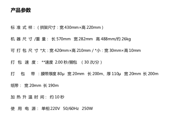 可以使用「纸带」或「透明胶带」捆包,采用热熔式粘接,产品捆包简便、美观。适合纸制品、药品、化妆品、电子产品及一般轻型物品使用。