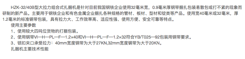 HZK-32/40B型组合式气动钢带主要用于捆扎包装彩色卷板和外包装使用木箱的产品,也适用于木制品业、造纸业、玻璃制造业的产品捆扎包装。其特点是以操作者的双手为动力,操作灵活方便、快捷。适应任何场地作业。本机不使用锁扣、降低了包装成本。